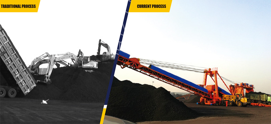 1).Process Flow :Bulk cargo transported by truck- -Feeder chute- -Feeding Belt conveyor- -Transfer  chute- - boom conveyor--Material field